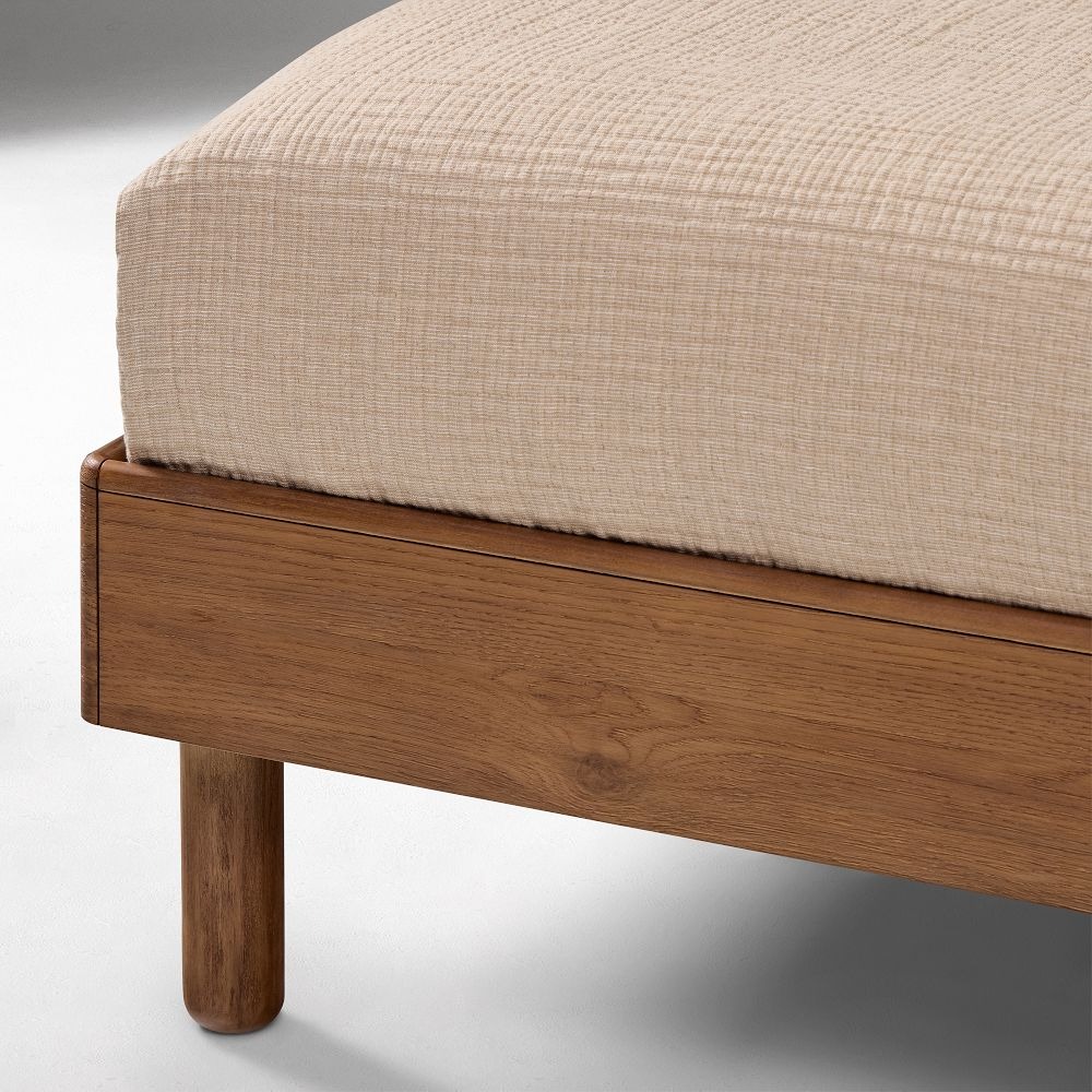 Dieses Bettgestell ist ein Schlafmöbel für den Innenbereich und besteht aus einer Kombination aus Massivholz und Holzwerkstoffen mit Eichenfurnier. Die Oberfläche ist in einem Holzfinish ausgeführt. Das verwendete Holz ist kammergetrocknet, um die Materialstabilität zu erhöhen, und stammt aus zertifizierter, verantwortungsvoll bewirtschafteter Forstwirtschaft.